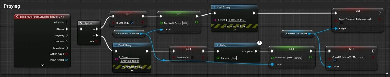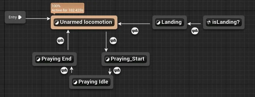 If the boolean is true then you begin to play the start animation followed directly by the Idle animation. If then the boolean is false, the praying end animation is played, after which the praying sequence is finished. The sequence is as follows: if the Boolean variable is true, the start animation is played, immediately followed by the idle animation. If the Boolean variable is false, the praying end animation is triggered, and the praying sequence is finished.