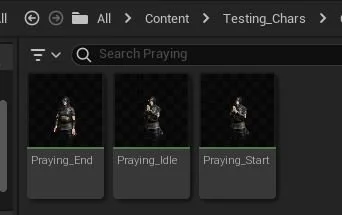 To achieve this, I needed to ensure that the player could maintain the praying position for as long as desired. To accomplish this, I divided the animation into three segments: the beginning of the prayer, the idle prayer position, and the conclusion of the prayer. Each of these animations was exported into Unreal Engine, as we learned in our previous class.
